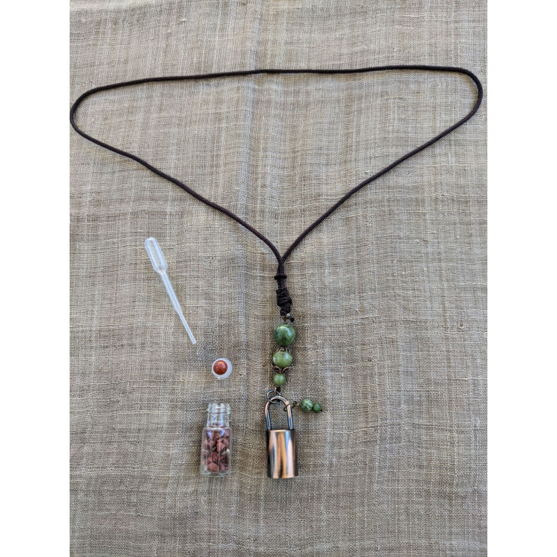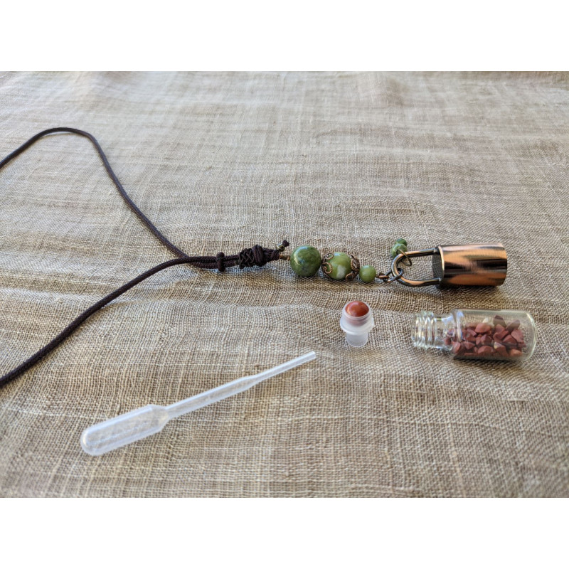 Bouteille de verre avec a l’intérieur un roller et des pépites de jaspe rouge, avec la pipette vous pouvez rajouter des huiles essentiels... ou pas