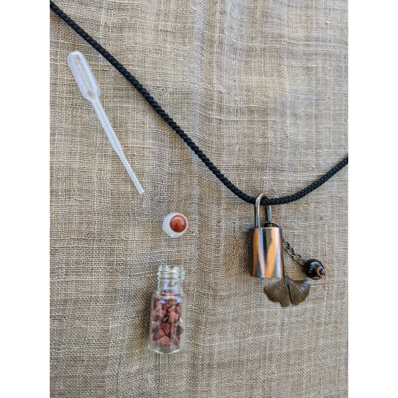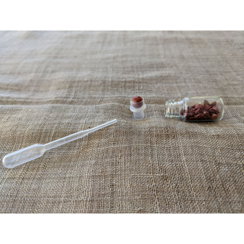 Bouteille de verre avec a l’intérieur un roller et des pépites de jaspe rouge, avec la pipette vous pouvez rajouter des huiles essentiels...