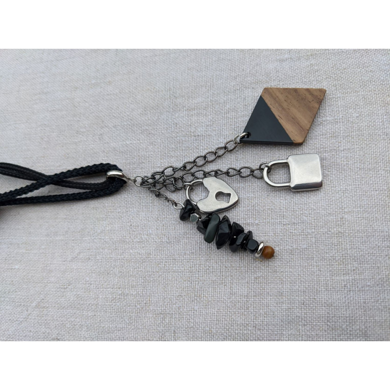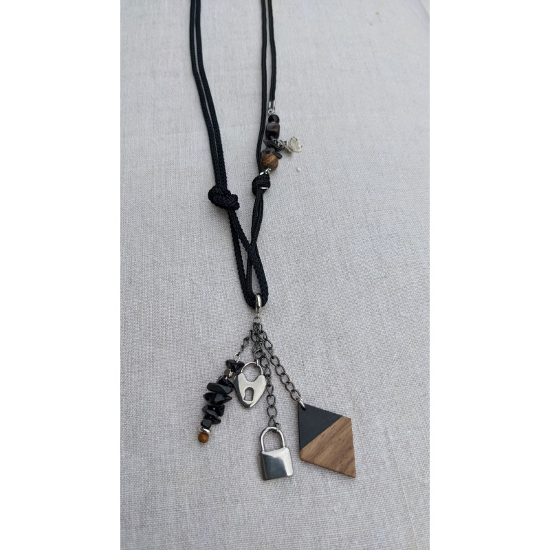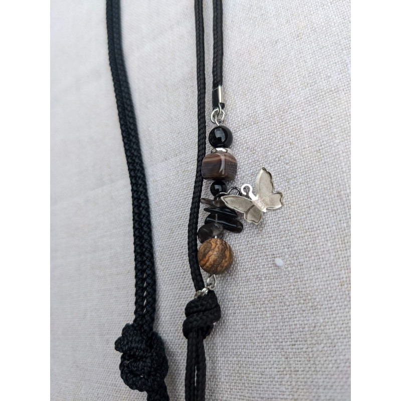 sautoir pampilles fils tressés noir se porte en asymétrique. Collier aérien à porter ton sur ton avec une tenue noir et beige