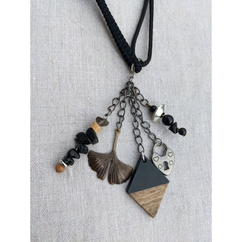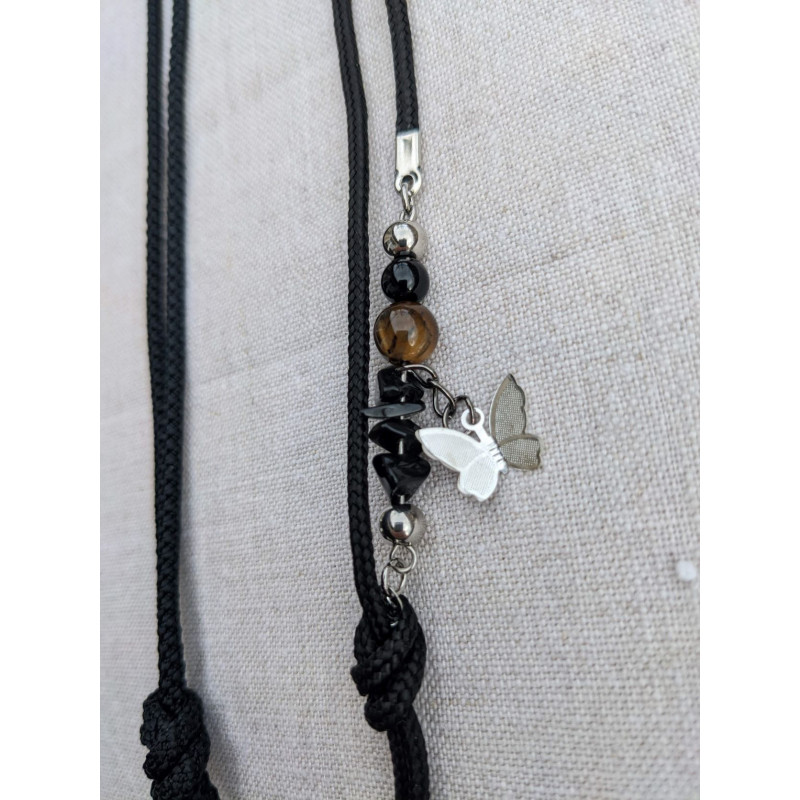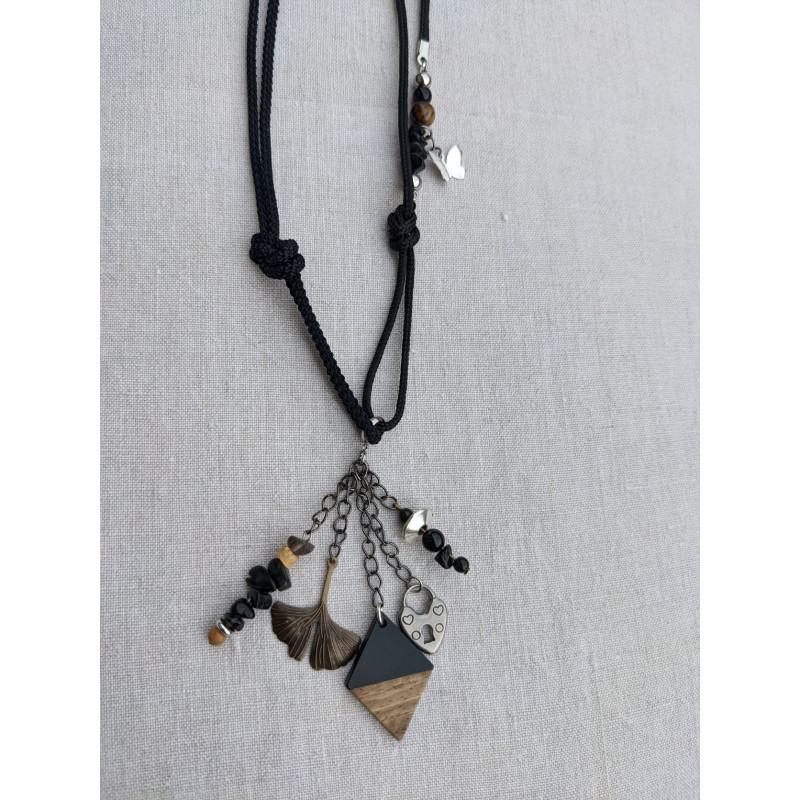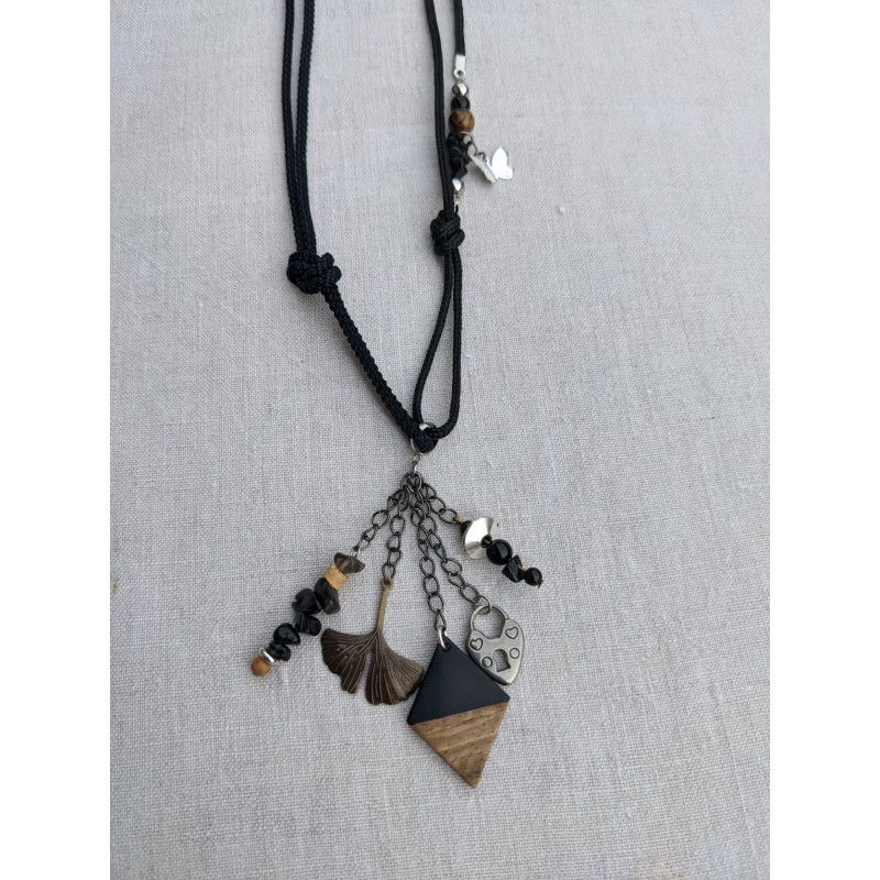 collier avec pampilles fils tressés noir. Collier aérien à porter ton sur ton avec une tenue noir et beige