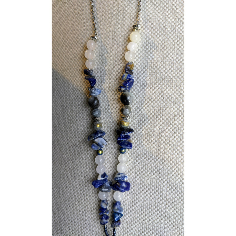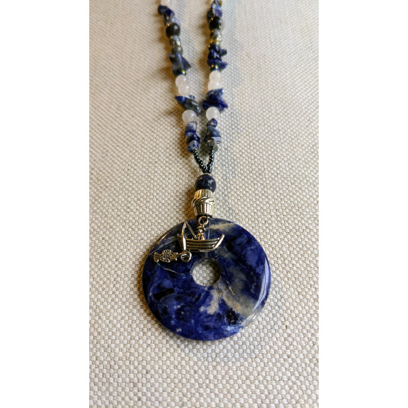 médaillon donut en agate bleu, perles en sodalite bleu et perles de jade blanche opaque