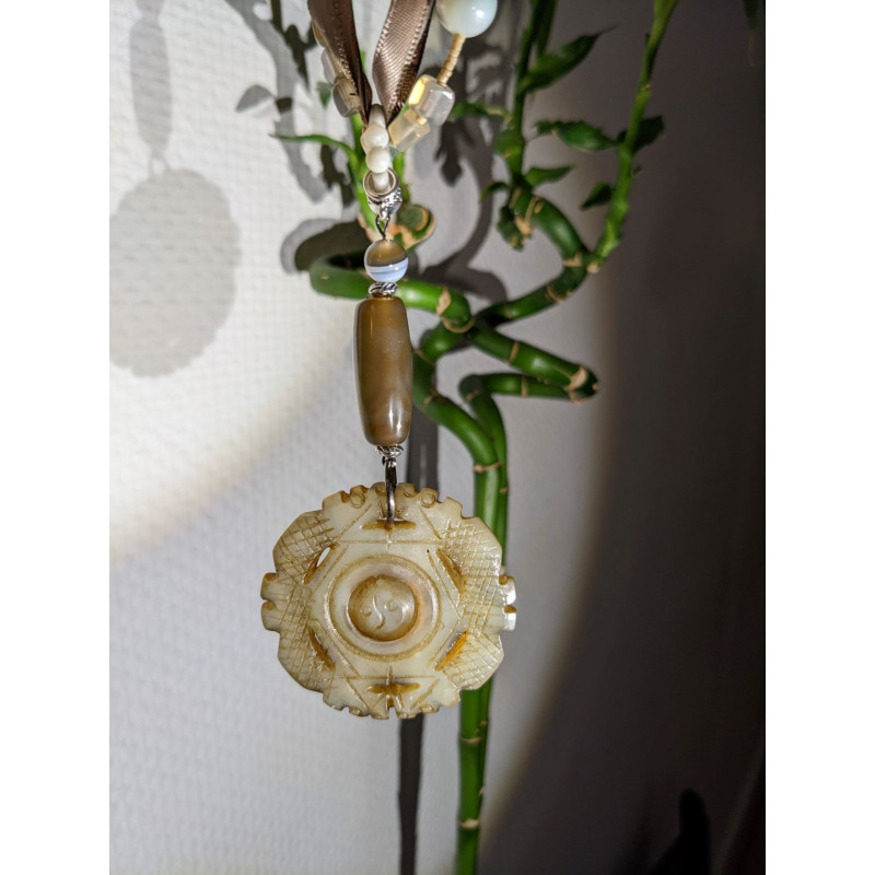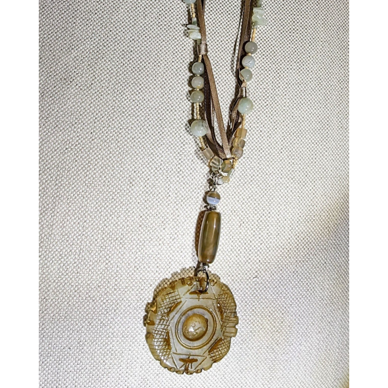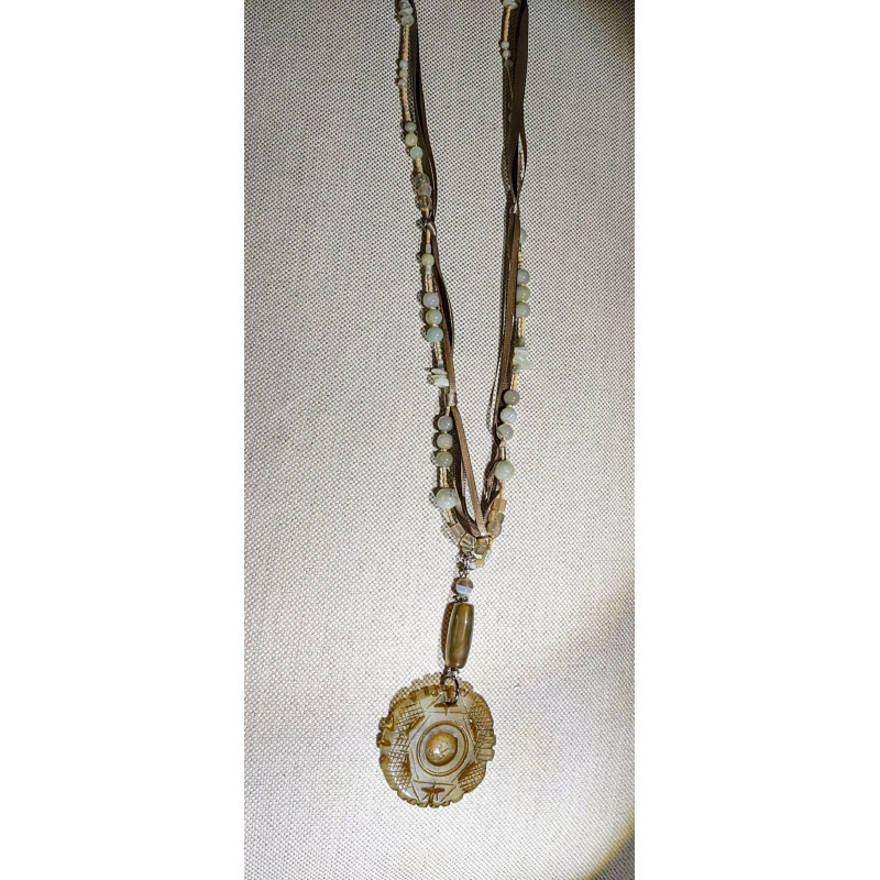 Sautoir avec un médaillon ancien en pierre dure avec un tour du cou avec des perles d'amazonite et noué avec des rubans de satin