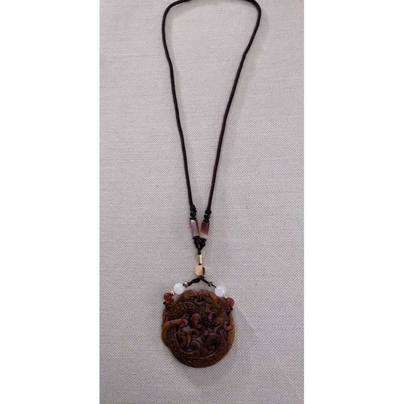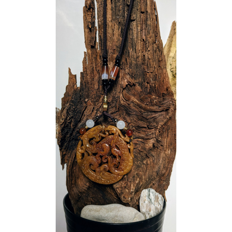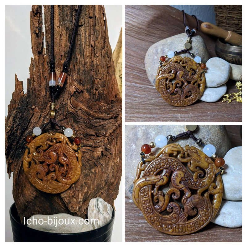 Médaillon en Henan de jade naturel. Le jade aide à trouver la paix intérieure ce qui favorise l'apaisement du mental. L'esprit se libère et laisse place à la quiétude.